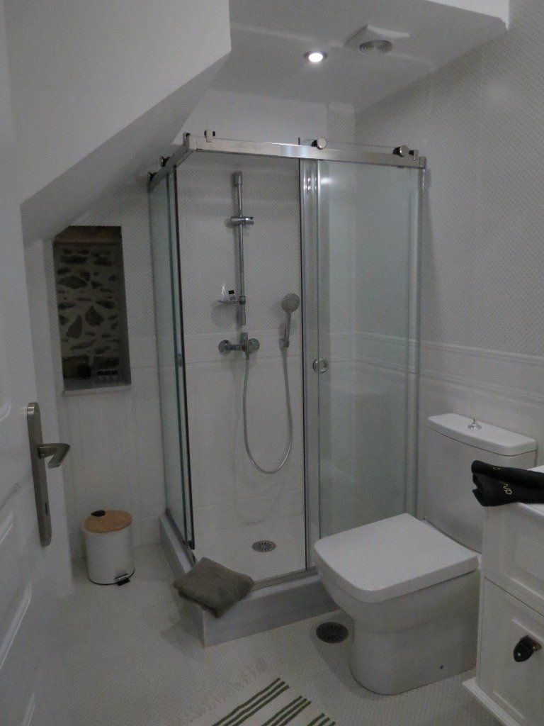 Bathroom with shower, equipped with luxury amenities and hair dryer